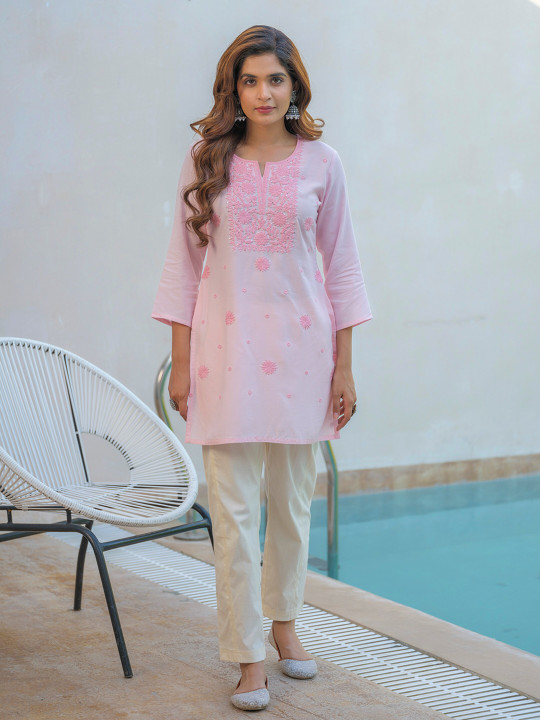 Floral Embroidered Mandarin Collar Straight Short Kurti